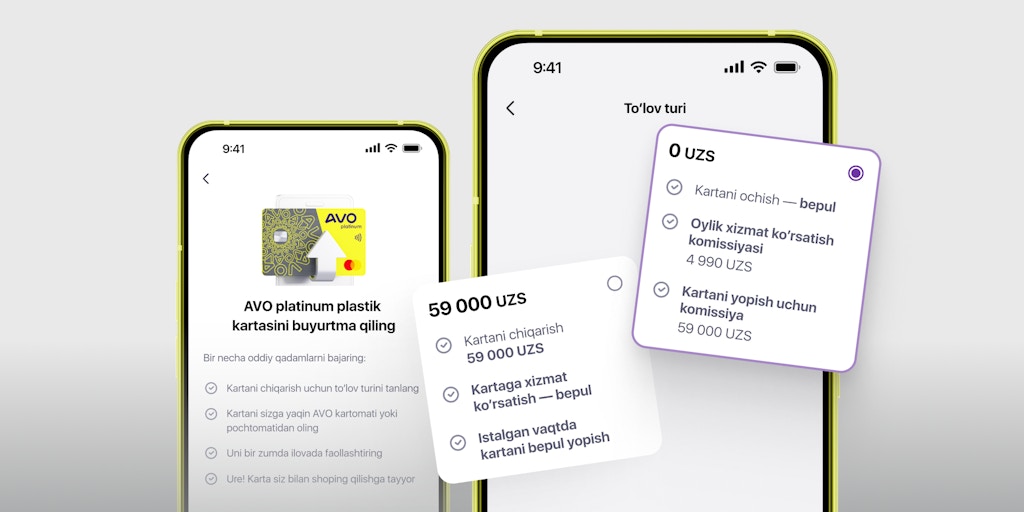 Раньше оформить пластиковую карту можно было только одним способом — осуществив предоплату 59 000 сумов. Не всегда удобно прощаться с такой суммой за раз. Поэтому AVO подготовил возможность выбора типа оплаты: с предоплатой, как раньше, или с бесплатным выпуском, но с ежемесячной комиссией.