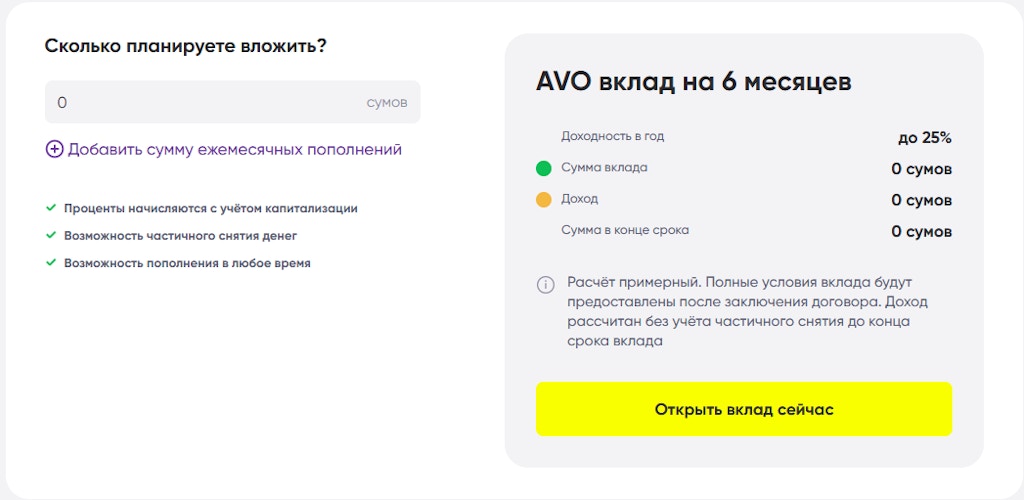 Некоторые банки Узбекистана предлагают ставки выше средней по рынку. Один из таких примеров — AVO bank. На сайте финансовой организации указано, что вклад может принести до 25% годовых. Доходность выше средней ставки по рынку.