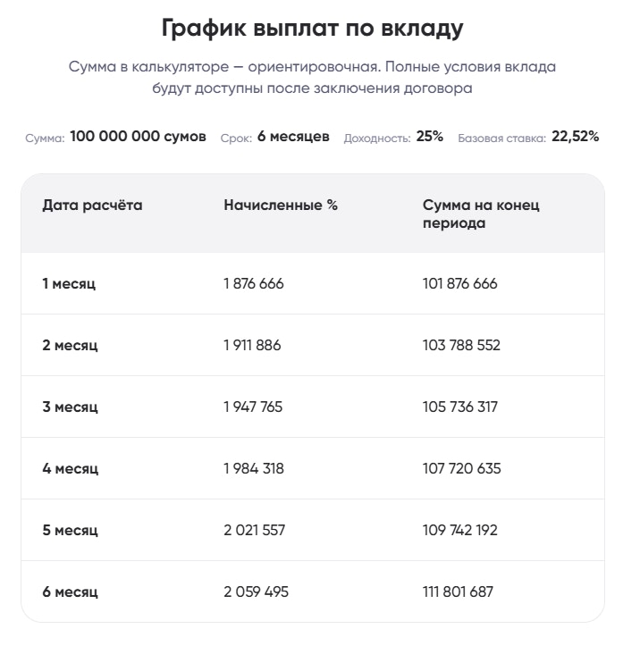 Как это работает: каждый месяц банк начисляет проценты и сразу прибавляет их к вашему балансу. За счет такой капитализации сумма растет быстрее. Положите, например, 10 миллионов сумов на вклад и продлите договор еще раз через полгода — в итоге получите около 2,5 млн сум чистого дохода. Проще говоря, чем дольше деньги лежат, тем больше они зарабатывают.