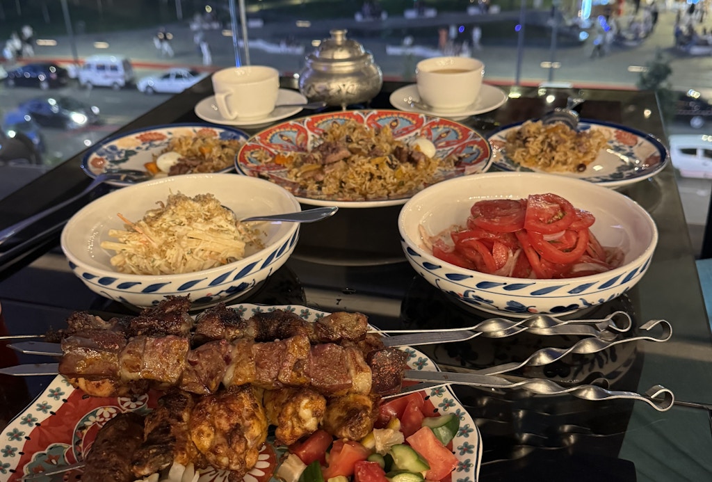 Сверкающий кусочек Дубая — такую ассоциацию вызывает свеженький Ташкент Сити. Ярко, красиво, уютно. Здесь, наконец, очередь дошла до плова и шашлыка. В заведении «Бабай» с лучшими видами на красоты Сити. Прекрасный вечер, отменные блюда национальной кухни, если бы только не одна ситуация... Официант стоял над душой, ожидая нашего ухода, чтобы посадить следующих посетителей. Сам же ужин обошёлся около 400 000 сумов на двоих (алкоголя там нет).