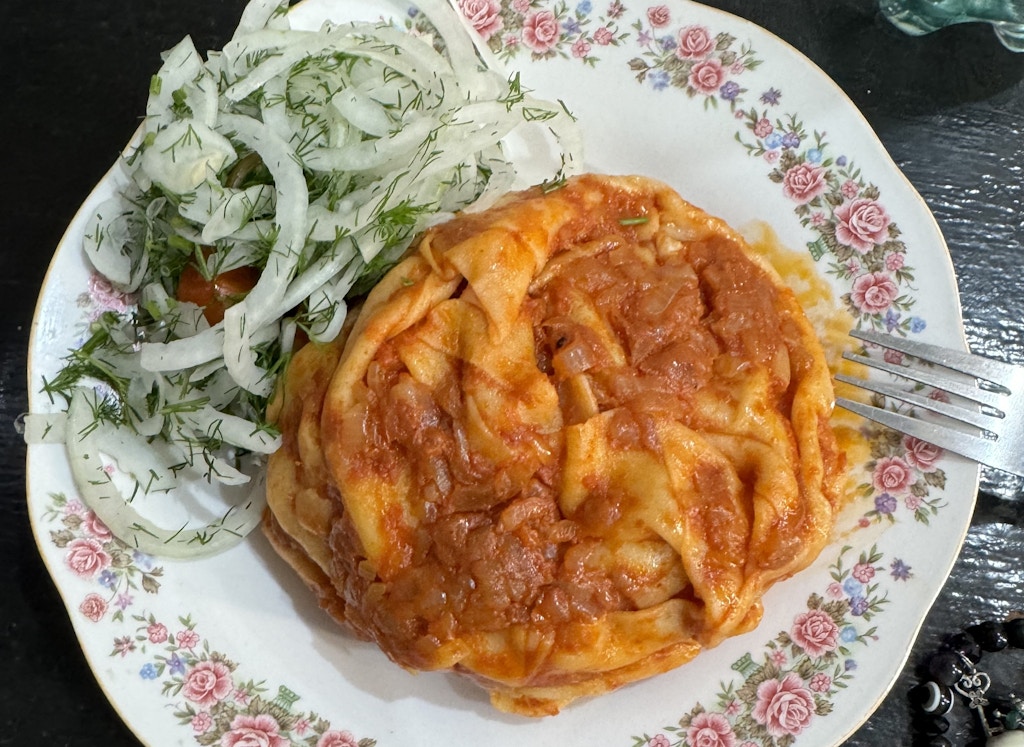 Надо же было прожить 35 лет в Ташкенте и ни разу (!) не попробовать знаменитый ханум на жорных рядах на рынке Чорсу. Это упущение было срочно исправлено. Потому что даже если известный блогер и тиктокер Уилл Эггертон пробовал, что уж говорить об исконной жительнице. Гештальт с Чорсу ханумом был торжественно закрыт. Казалось бы, тесто с картошкой и луком под томатным соусом — но до чего же это вкусно! И всего лишь 7 000 сумов за штуку.