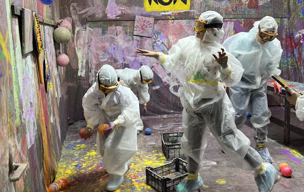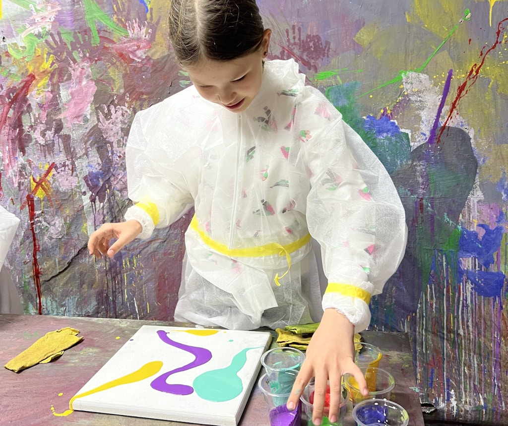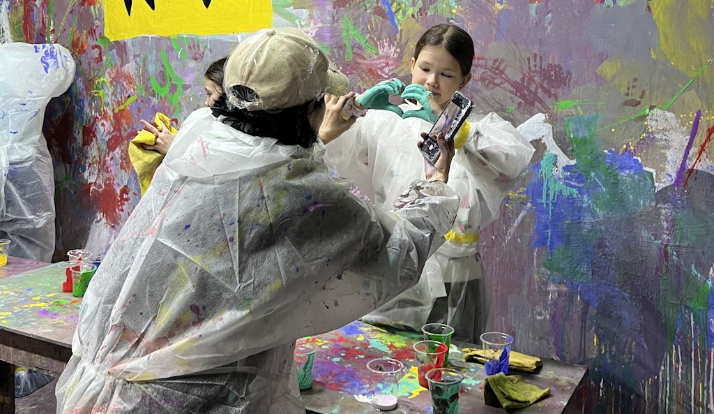 Ещё из необычных локаций – студия Koa, где мы отмечали день рождения. Я называю её комнатой для выплеска эмоций. Записаться нужно заранее. По программе сначала вам выдают инструкцию и защитные костюмы, хотя предупреждают, чтобы вы всё равно оделись в вещи, которые не жалко запачкать. Сначала проводят своего рода арт-терапию — вам дают холсты и краски, чтобы создать собственную абстрактную картину. Потом детям дают возможность измазаться краской, порисовать на стенах, оставить свои отпечатки.