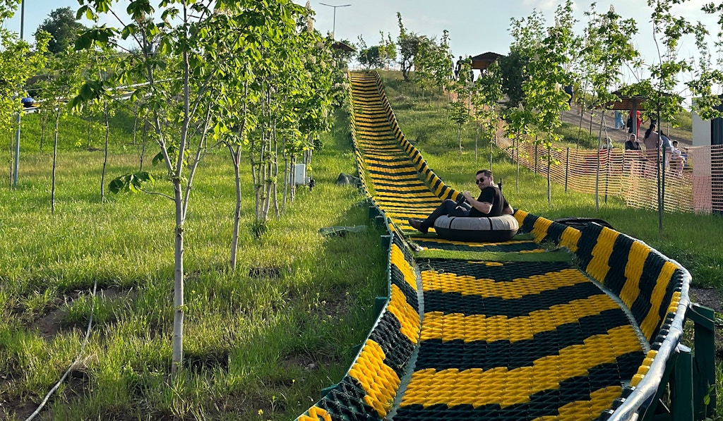 Из классных локаций для активного отдыха — это Верёвочный городок в Amirsoy. В этой локации много маршрутов разного уровня сложности и высоты в зависимости от возраста и физической подготовки. На тебя надевают снаряжение, страховку, и ты на высоте проходишь разные препятствия. Это очень увлекательно.