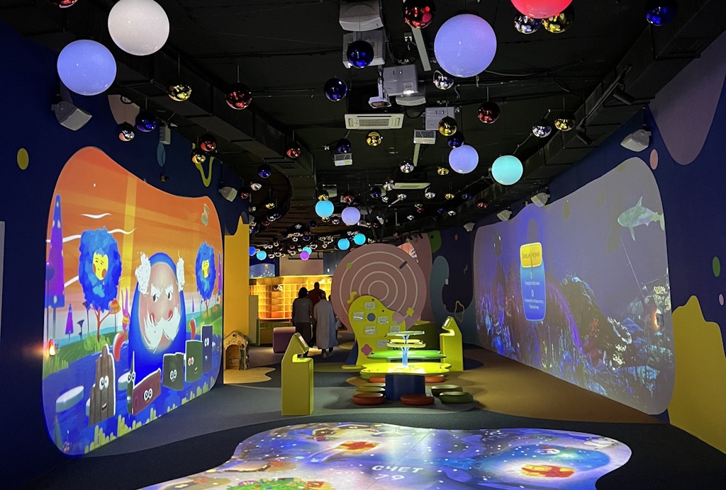 Моей дочке понравилась игра «Огненный прыгун» — дети прыгают на батутах, а на экране их аватар преодолевает препятствия и набирает очки. Она там, конечно, напрыгалась от души. Я сама наслаждалась «Интерактивной песочницей». Как это работает? Насыпаешь горку песка — поверх проявляются проекции зелени, животных, растений; выкапываешь ямку — она наполняется водой, там появляются крокодилы и прочие земноводные и т. д. Это безумно красиво. На территории много таких зон, где датчики реагируют на твои движения, на какие-то действия и переносят их на экран.