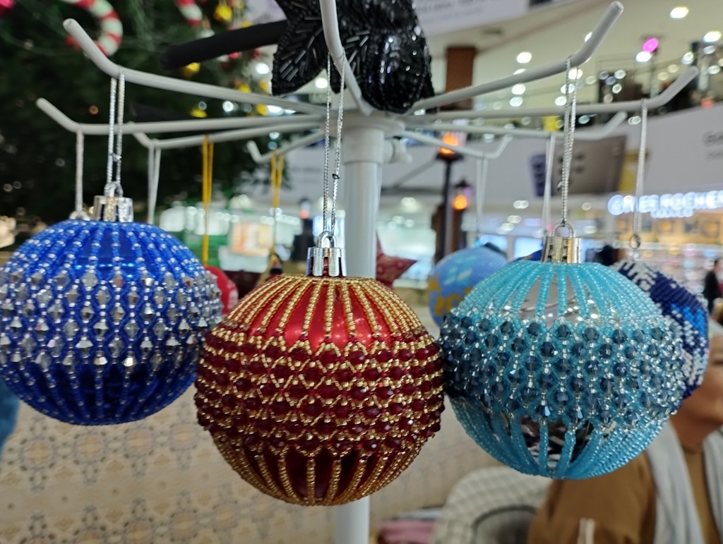 Если вам нравятся авторские работы, но бюджета на европейскую роскошь нет, то вы можете найти достойные изделия у местных мастеров. На 2-м и 3-м этажах ТЦ Samarqand Darvoza продают свои работы ремесленники, которых объединяет компания Sogdiana. Тут можно приобрести ёлочные игрушки, расписанные в технике декупаж, вручную или расшитые бисером, вязанных змеек, фонари. В росписи некоторых шаров есть мотивы национальных орнаментов, они упакованы в красивые подарочные коробки. Один такой шар может стоить от 120 до 370 000, а набор — от 300 000 до 1 млн.