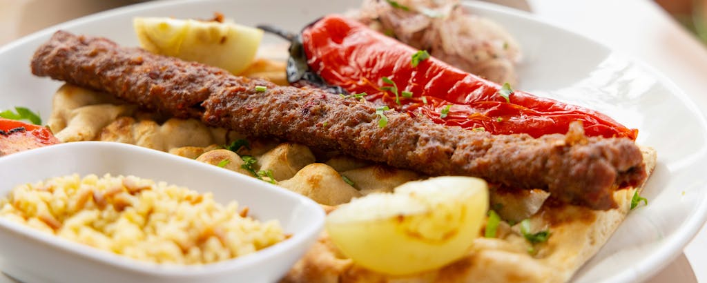 И внутри тоже есть на что посмотреть: на стенах видна текстура ковров, а местами на потолке висят уже не просто текстуры, а самые настоящие восточные ковры. Есть терраса, просторная и светлая, с хорошим видом на город, но сесть там я не смог — было уж очень жарко. Внутренний зал не уступает террасе: прохладно, приятно темно, удобные столики и кресла. Но есть нюанс: очень много людей вокруг. Место семейное, находится в популярном ТЦ, тут можно встретить и туристов, и местных, в итоге весь зал полон звуков, голосов, разговоров и спокойно посидеть здесь практически невозможно.