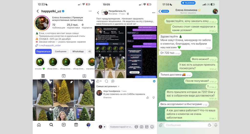 В Инстаграм я нашёл страницу с премиальными литыми ёлками. Вроде много подписчиков, фото, видео, хорошие отзывы. Я написал, спросил, какие условия и можно ли с доставкой и установкой, если я доплачу. Мне отвечали профессионально, прислали прайс, сказали, что работают по Ташкенту, доставка и установка есть. За модель, которую я выбрал, объявили 3 млн сумов. Я даже поторговался с ними, они сказали что в качестве скидки доставят и установят бесплатно, но нужна предоплата 100%. Прислали номер карты. Я перевёл деньги. Позвонил матери, обрадовал её. Потом хотел отправить в чат с магазином контакты матери для доставки. Открываю чат, а там вся переписка удалена. Я пишу — не отвечают.