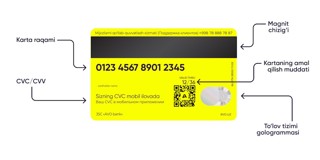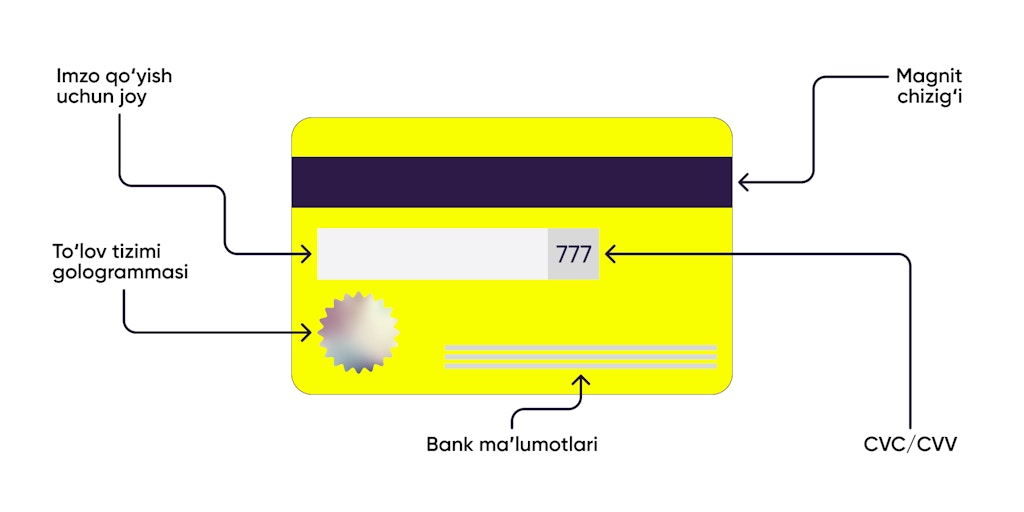 4. CVC yoki CVV — bu kartaning orqa tomonidagi uchta raqamdan iborat kod. Mahalliy Humo va Uzcard kartalari ushbu kodlarsiz chiqariladi. Kobeydjing kartalari — bundan istisno. Kobeydj yordamida karta bir vaqtning o’zida ikkita to’lov tizimi bilan ishlay oladi. Masalan: Humo-Visa, Uzcard-Mir, Humo-Mastercard yoki Uzcard-Unionpay.