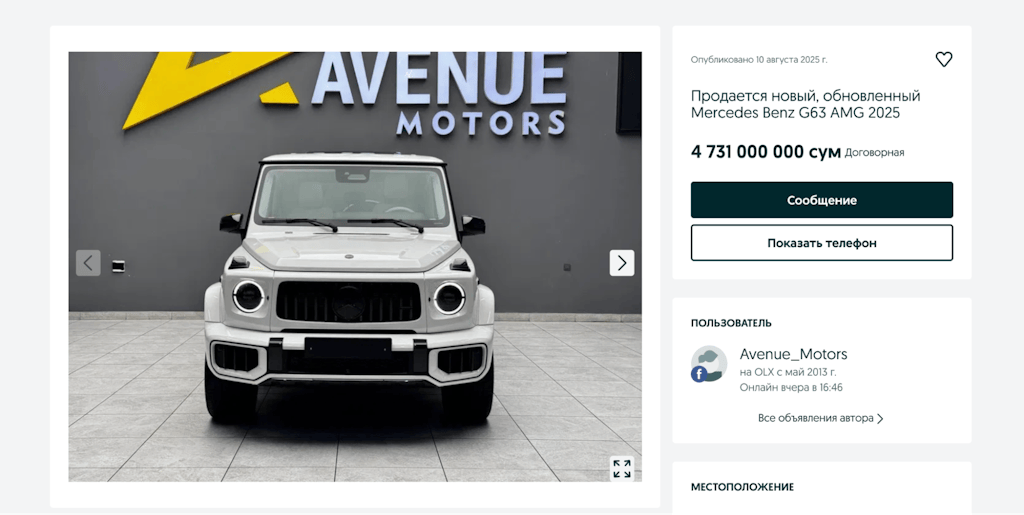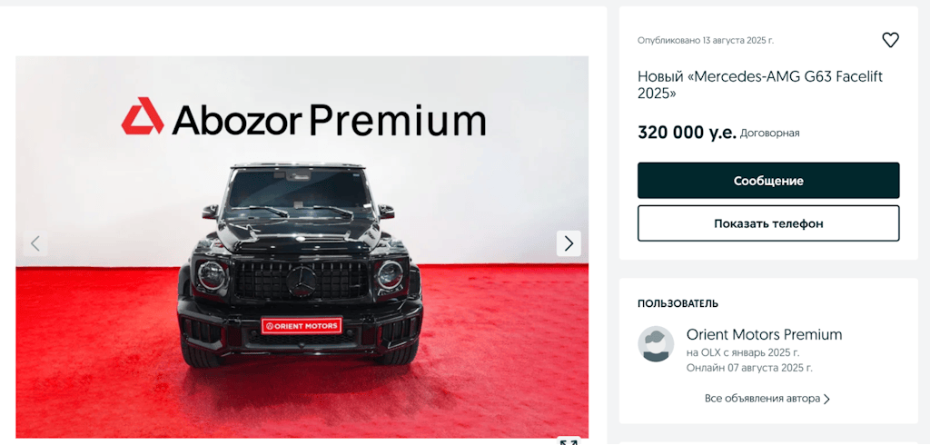 Modellar | Faqat original Mercedes-Benz G-Class va AMG: G 500, G 63, G 580 Electric | Keng tanlov imkoniyati: original, tyuning qilingan (BRABUS, Mansory va boshqalar), hamda haydalgan mashinalar | Hamma variantlar: original, tyuning, kastom, noyob komplektatsiyalar, haydalgan mashinalar |