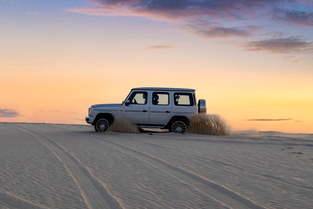 AMG G 63 hozirgi davr hamda shu maqolaning bosh qahramoni. Uni darrov tanib olasiz: kattakon havo qabul qilgichlar, qizil tormoz supportlari, qo‘pol disklar va AMG gaz chiqarishlarining o‘ziga xos g‘uvullashi. Kapot ostida 2 turbinali V8 dvigatel va 585 ot kuchigacha quvvat bo‘lib, bu g‘ishtdek og‘ir mashinani sportkarga aylantirib yuboradi. Bu yerda falsafadagi farq shundaki: asosiy G — klassika bo‘lsa, AMG dinamika va drayvga boy.