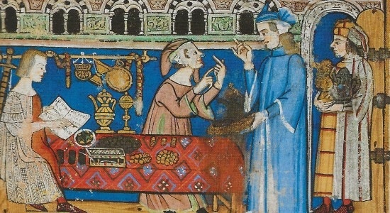 Lombarddagi savdo-sotiq. Kocharelli risolasi, taxminan 1330-yil. London, Britaniya kutubxonasi, 27695-sonli qo‘lyozma, 7-asr.