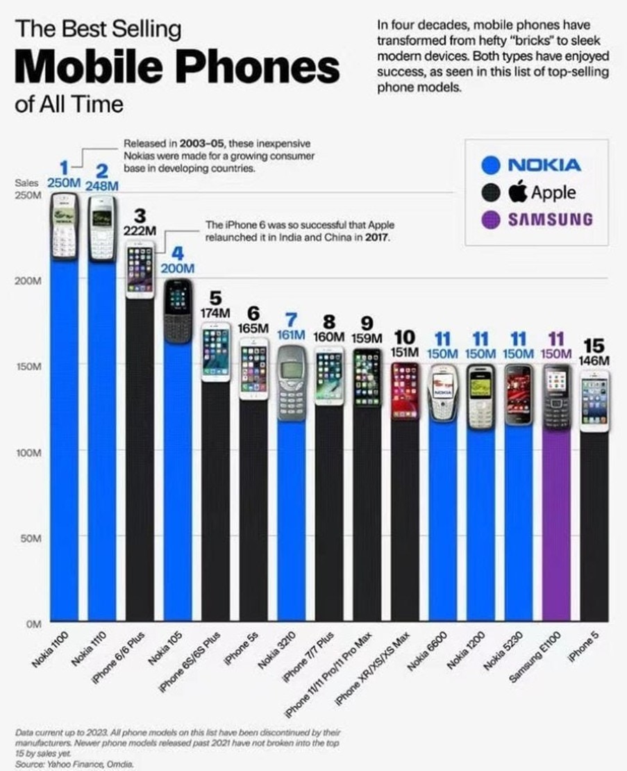 Boshqa bir grafik ham qiziqarli bo‘lib, unga ko‘ra, barcha davrlarning eng ko‘p sotilgan smartfoni iPhone 6/6 Plus hisoblanadi. Insoniyat tarixidagi eng ko‘p sotilgan 15 ta telefon reytingida ushbu iPhone’lar 174 million dona sotilgan qurilma bilan uchinchi o‘rinni egallaydi.