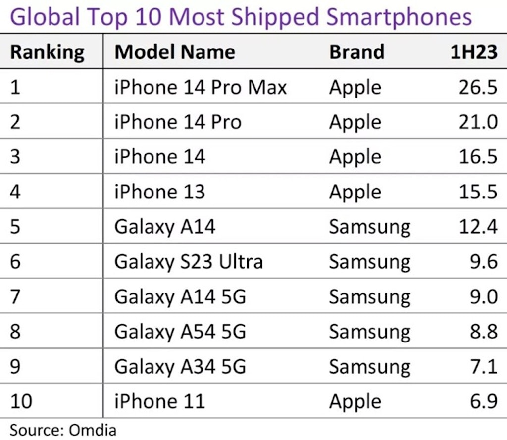 Masalan, 2023-yil avgust oyida Omdia tadqiqot kompaniyasi hisobot e’lon qildi. Unga ko‘ra, birinchi yarim yillik davomida sotilgan qurilmalar soni bo‘yicha reytingning dastlabki to‘rtta o‘rnini iPhone’lar egallagan. Apple kompaniyasining o‘sha paytdagi eng qimmat smartfoni hisoblangan iPhone 14 Pro Max 26,5 million dona miqdorida sotilgan.