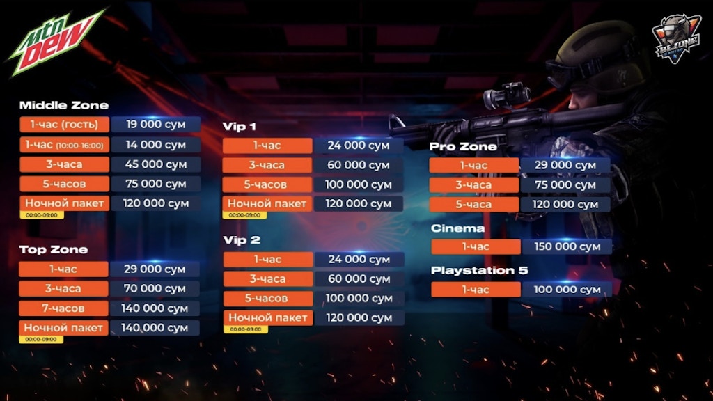Narxlar unchalik yuqori emas: asosiy zonada 1 soat o‘ynash sizga 15 000 so‘mni tashkil etadi. Xohishingizga ko‘ra, narxni 30% gacha tejashga yordam beradigan turli paketlarni xarid qilishingiz mumkin — lekin bu faqat o‘yin maskanida 5 soatdan ortiq vaqt o‘tkazishni rejalashtirayotgan bo‘lsangiz, to‘g‘ri keladi.